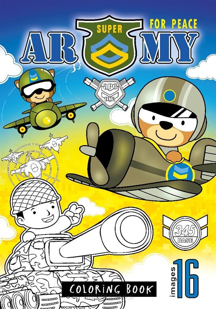 Kolorowanka dla dzieci. Na każdym z 16 obrazków znajduje się obrazek związany wojskiem, który tylko czeka żeby nabrać kolorów. Świetna zabawa dla każdego małego żołnierza! Wyprodukowana na Ukrainie.