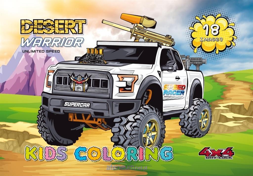 Kolorowanka dla dzieci. Na każdym z 18 obrazków znajduje się obrazek z monster truckiem, który tylko czeka żeby nabrać kolorów. Wyprodukowana na Ukrainie.