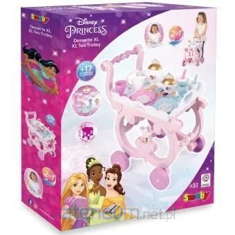 Uroczy wózeczek z praktyczną rączką i zdejmowaną tacą, z 17 akcesoriami, w tym kubeczki, łyżeczki i talerzyki, cukiernica oraz czajniczek. Wyprodukowana we Francji. Wymiary: 44 x 31 x 47,5 cm, 3l+