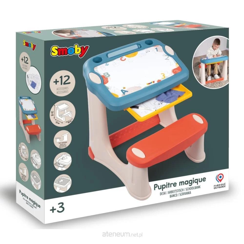 Stolik z nachylonym blatem idealny do malowania i pisania. Pod spodem znajduje się wysuwana szuflada, w której można schować długopisy lub inne akcesoria. W zestawie 12 akcesoriów w tym kolorowanki, flamaster i szmatka do czyszzcenia tablicy. Wyprodukowane we Francji.. Wymiary: 56 x 57 x 52 cm; 3 l+