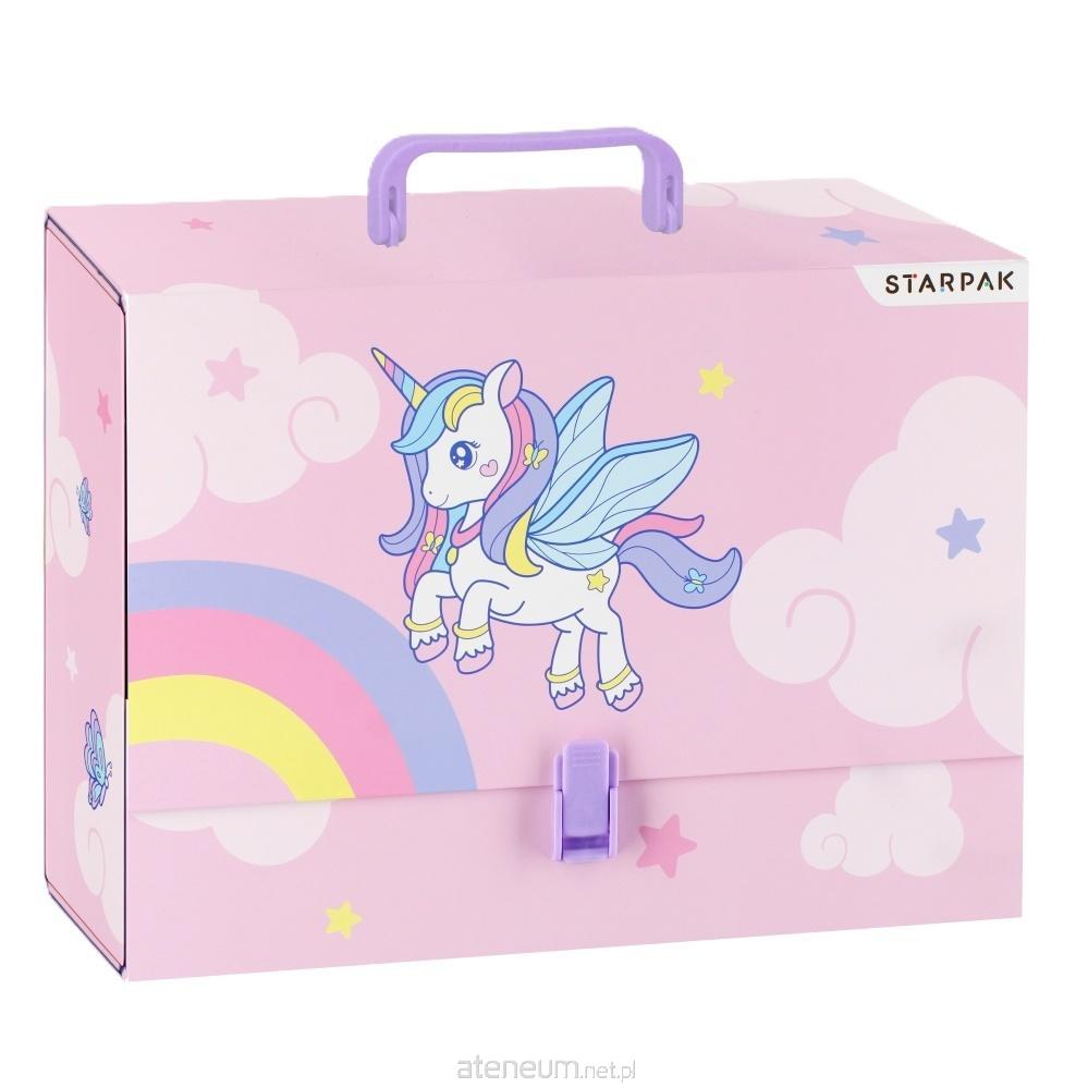 Teczka z rączką z kolekcji STARPAK z serii Unicorn. Sztywna teczka wykonana z grubego, lakierowanego kartonu. Zamykana na plastikowy klips. Teczkę wyposażono w solidną rączkę. Teczka o szerokości grzbietu 9,5 cm. Idealnie sprawdzi się na zajęciach pozaszkolnych czy do przechowywania prac dziecka.