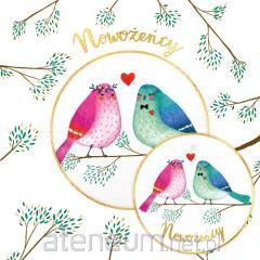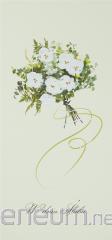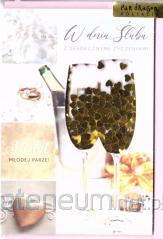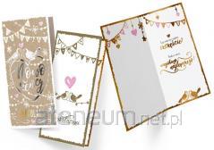 Składany z trzech stron kwadratowy karnet o wymiarach 15 x 15 cm z wyciętym elementem na froncie. Złocony i tłoczony, teksy życzeń w środku. Wydrukowany na wysokiej jakości papierze. W zestawie bilecik do prezentu oraz koperta.