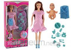 Lalka (typu Barbie) w ciąży. Brzuszek lalki można chować. W zestawie także akcesoria niemowlaka jak: gryzaczki, smoczek, butelka, miseczka. Produkt zapakowany w kartonowe opakowanie z przezroczystym okienkiem. Podane wymiary są wymiarami opakowania. Lalka przeznaczona dla dzieci od 3 lat.