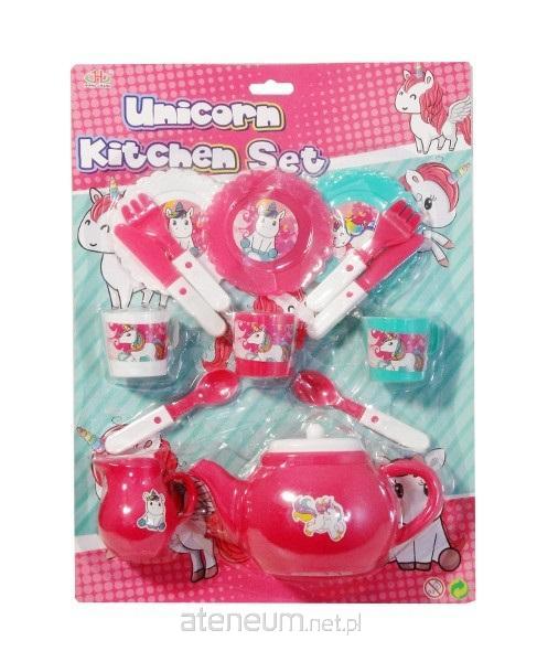 Zestaw plastikowych naczyń dla dzieci. W zestawie znajdują się: talerzyki, kubeczki, czajniczek, mlecznik i sztućce. Naczynia ozdobione są wizerunkami jednorożca. Produkt zapakowany w kartonową podstawkę z przezroczystym kloszem. Podane wymiary są wymiarami opakowania.