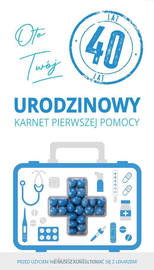 Karnet z okazji 40 urodzin z życzeniami, kopertą i humorystycznym dodatkiem w środku.