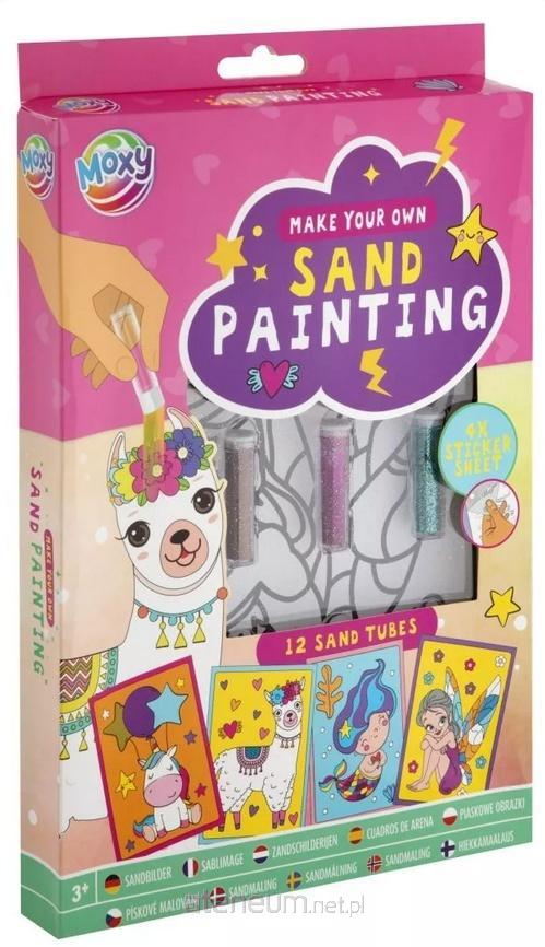 Nowa, kreatywna forma spędzania czasu dla dzieci-obrazki do pokrywania kolorowym piaskiem. Obrazki zawierają pola pokryte klejem, które po ich odsłonięciu można posypywać piaskiem i w ten sposób je kolorować. Każdy obrazek to kolejna okazja do wyboru najciekawszych połączeń kolorów. Zestaw zawiera: