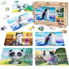 Zestaw puzzli: zabawa zestawem polega na łączeniu dwóch elementów w jeden tak, aby powstał obrazek zwierzaka. Aż 20 różnych obrazków przedstawia różnorodne zwierzęta domowe, takie jak pies, kot, królik czy kura. Dzięki temu dzieci mają możliwość poznawania różnorodnych gatunków zwierząt i ich cech charakterystycznych.