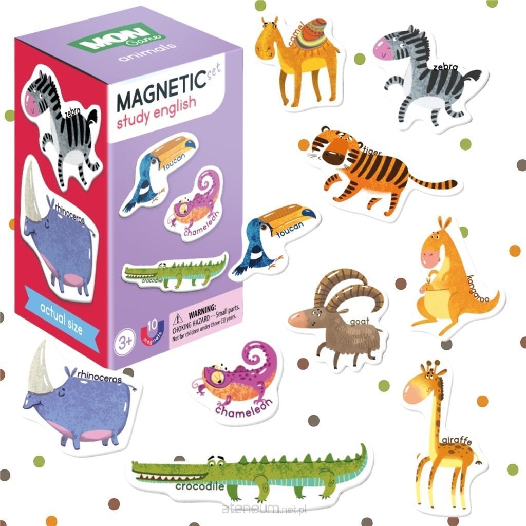 Zestaw magnesów przedstawia różnorodne zwierzęta, takie jak krokodyle, zebry czy kameleony, z dodatkowymi napisami z nazwami zwierząt w języku angielskim!