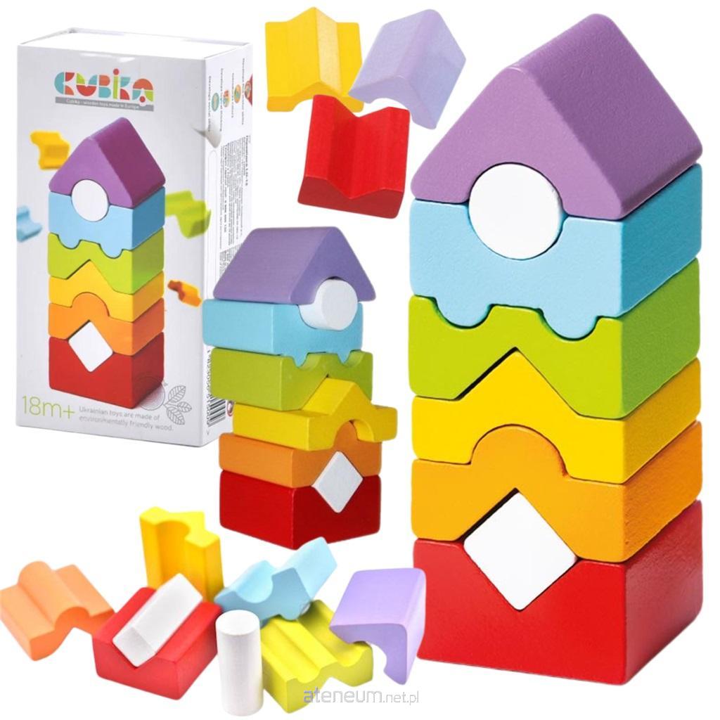 Zestaw składa się z różnokolorowych drewnianych klocków o różnych kształtach i rozmiarach. Dzieci mogą używać tych klocków do budowania wież, murów, budowli lub konstrukcji, łącząc je ze sobą w sposób, który pobudza ich wyobraźnię i kreatywność. Dodatkowo klocki należy umieścić w taki sposób, aby powstała stabilna wieża.