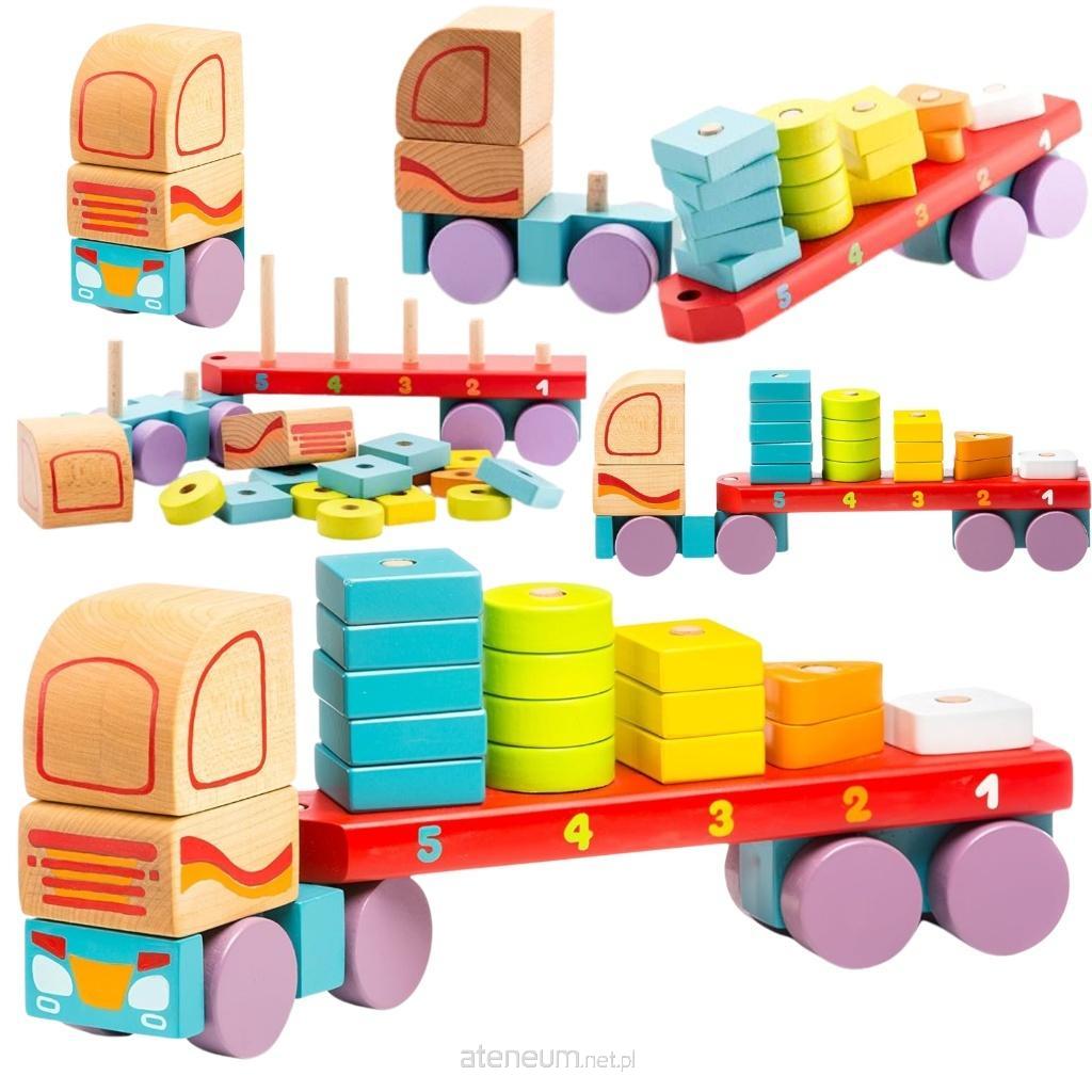 Zestaw składa się z drewnianej ciężarówki na kółkach. Na jej przyczepie znajduje się podstawa z prętami o różnych wysokościach, do których należy dopasować określoną liczbę klocków. Klocki posiadają rożne kolory oraz kształty.