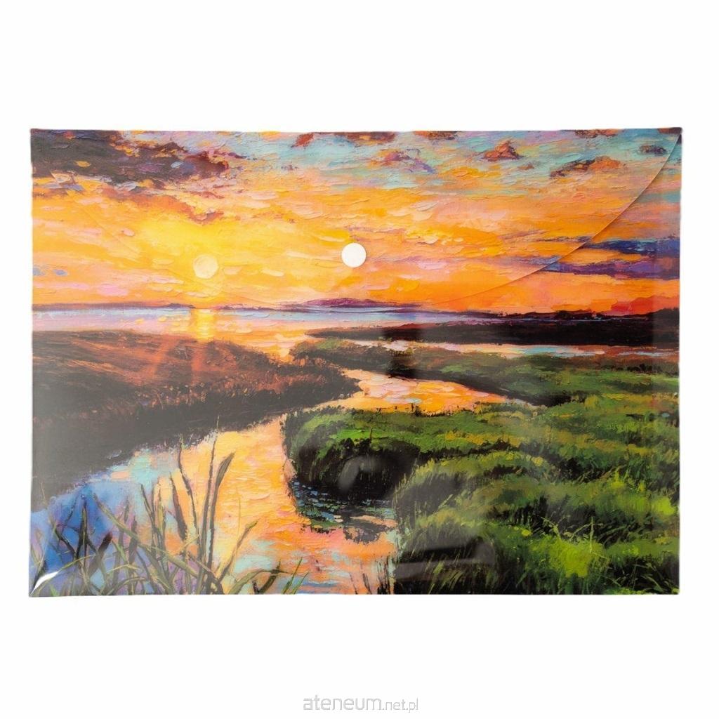 Ozdobna teczka kopertowa VISTA, wykonana z trwałego polipropylenu z nadrukiem w postaci impresjonistycznego widoku ujścia rzeki wpływającej do jeziora. Zamykana na zatrzask typu napa. Dzięki pełnemu zadrukowi, zawartość teczki pozostaje niewidoczna na zewnątrz. Idealne rozwiązanie do przechowywania dokumentów lub niewielkich płaskich przedmiotów.