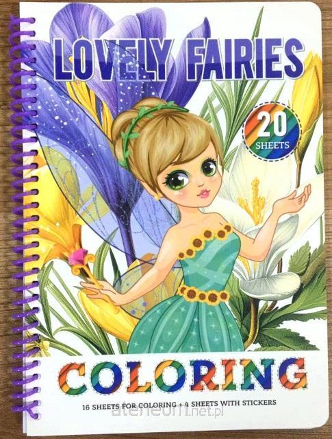 Kolorowanka dla dzieci. Zawiera 16 kartek z obrazkami oraz 4 strony wypełnione naklejkami. Okładka pokryta brokatem.