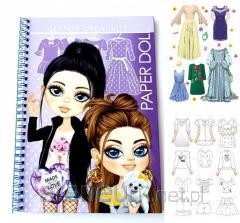 Papierowa lalka do zabawy. W środku znajdują się kolorowanki, naklejki, a także przebrania i lalki do powycinania. Pokoloruj stroje, wytnij z książeczki lalkę, a następnie ubierz ją - zaginając specjalnie zaznaczone krawędzie. Każde przebranie ma wyraźne oznaczenie pokazujące, gdzie wyciąć, aby strój idealnie pasował na lalkę. Wykorzystaj także naklejki, które znajdziesz w środku. Baw się opowiadając najróżniejsze historie. Wyprodukowano na Ukrainie.