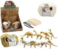 Zestaw zawiera gipsowy odlew z którego za pomocą narzędzi należy wydobyć szkielet dinozaura który świeci w ciemności, świetny zestaw, który pozwoli dziecku poczuć się jak naukowiec paleontolog.