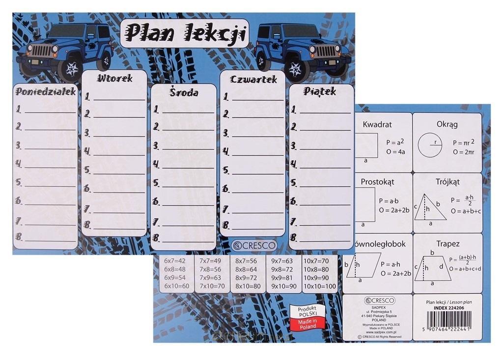 Plan lekcji dla ucznia o ciekawej grafice w formacie A5. Zawiera miejsce do samodzielnego uzupełnienia na pięć dni zajęć szkolnych. Z tyłu tabliczka mnożenia oraz podstawowe wzory matematyczne. Zapakowany w opakowanie zbiorcze - folię po 25szt.