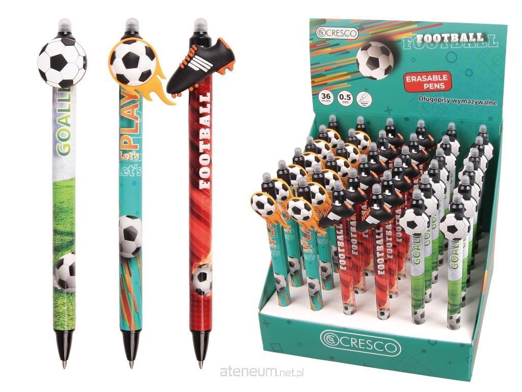 Długopis wymazywalny CRESCO o grafice Football z elementami piłkarskimi: buty, koszulka, piłka. Pstrykany system wysuwania niebieskiego wkładu o linii pisania 0,5mm. Opakowanie zawiera 36szt w mixie wzorów.