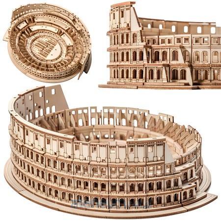 Drewniane puzzle 3D w kształcie Rzymskiego Koloseum. Zestaw został wykonany z wysokiej jakości sklejki i jest w postaci arkuszy z wstępnie wyciętymi i ponumerowanymi elementami. Przed montażem należy oddzielić części od wykroju, a następnie połączyć bez użycia kleju, zgodnie ze szczegółową instrukcją dołączoną do opakowania. Zabawka edukacyjna, która po złożeniu może również służyć jako dekoracja. Uwaga - zestaw może zawierać małe elementy, podczas składania puzzli, dzieci muszą pozostać pod opieką dorosłych.
