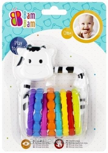 Grzechotka Krówka BAM BAM przeznaczona dla niemowląt. W intensywnej kolorystyce, o zróżnicowanej fakturze materiałów jak i różnorodnej formie, posiada elementy interaktywne zachęcające malucha do zabawy, a jednocześnie stymulujące rozwój jego zmysłów wzroku, słuchu oraz zdolności motorycznych. Liczne uchwyty gwarantują bezproblemowe utrzymanie grzechotki w małych rączkach. Wymiary/waga/baterie: wymiary produktu (dł. x wys. x gł.)[cm]: 10x12x6, wymiary opakowania (dł. x wys. x gł.)[cm]: 15x21x7, waga produktu bez opakowania [kg]: 0,09 kg, waga produktu w opakowaniu [kg]: 0,11 kg, nie wymaga zasilania bateriami. Zabawka przeznaczona dla dzieci w wieku: 0m+. Pakowana na blistrze.
