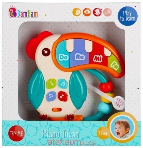 Kolorowe Pianinko Tukan to niezliczona ilość opcji komponowania i aranżacji własnych linii melodycznych dla dziecka. 8 kolorowych przycisków umożliwia maluchowi wybór melodii lub piosenki, która najbardziej odpowiada jego gustowi muzycznemu. Zabawę i doznania słuchowe uatrakcyjniają efekty wizualne w postaci migoczących przycisków. Potrząsanie zabawką wydobywa naturalne dźwięki grzechotki, dzięki umieszczonym kolorowym okręgom na pałąku. Przesuwanie ich własnoręcznie urozmaica zabawę jednocześnie aktywizując zdolności manualne dziecka. Zabawka wszechstronnie rozwija zmysły dziecka jak i jego predyspozycje intelektualne i manualne. Uczy związku przyczyna -skutek, ćwiczy zręczność oraz koordynację ruchową. Wymiary/waga/baterie: wymiary produktu (dł. x wys. x gł.)[cm]: 14x14x3, wymiary opakowania (dł. x wys. x gł.)[cm]: 19x20x5, waga produktu bez opakowania [kg]: 0,13 kg, waga produktu w opakowaniu [kg]: 0,50 kg, wymaga zasilania bateriami 2 x AAALR03- załączono do zestawu. Zabawka przeznaczona dla dzieci dla dzieci w wieku: 18m+. Pakowany w kartonik z okienkiem.