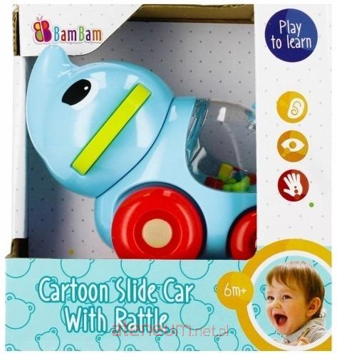 Grzechotka - Autko o kształcie uroczego SŁONIKA z obracającymi się kuleczkami w brzuszku zachwyci niejednego maluszka. Jeżdżący zwierzaczek z kuleczkami Bam Bam zapewnia masę zabawy, mobilizując dziecko do podejmowania samodzielnych prób raczkowania czy też chodzenia. Zabawka podczas poruszania wydaje szeleszczące dźwięki, dzięki tęczowym kuleczkom umieszczonym w brzuszku zwierzaczka. Dodatkowo obracające się, bajecznie kolorowe kuleczki dostarczają bodźców wzrokowych wspierając rozwój zmysłów wzroku oraz percepcji. Obły kształt ułatwia chwytanie zabawki, a kółka umożliwiają wprawianie zabawki w ruch bez trudu za pomocą pchnięcia.