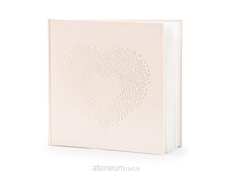 Księga Gości oprawiona papierem w kolorze jasnego różu ze wzorem, wymiary ok. 20,5 x 20,5 cm, 22 kartki, bez tekstu.
