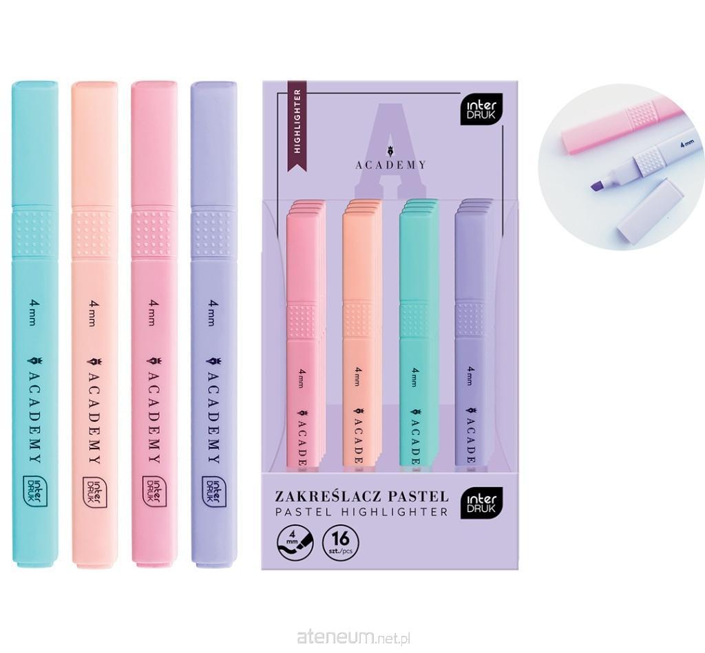 Zakreślacz w 4 pastelowych kolorach: fioletowym, różowym, pomarańczowym i zielonym. Kwadratowy profil. Matowe wykończenie. Ścięta końcówka o szerokości do 4 mm.