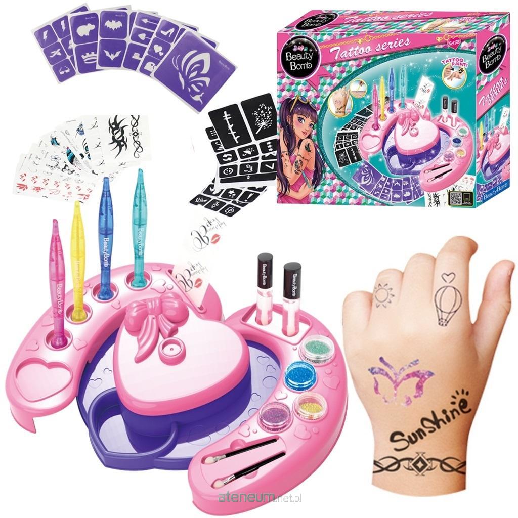 W zestawie oprócz kuferka znajdziecie 4 pisaki do tatuażu w modnych kolorach, kleje do brokatu, brokaty w 4 kolorach, klej oraz mnóstwo szablonów!