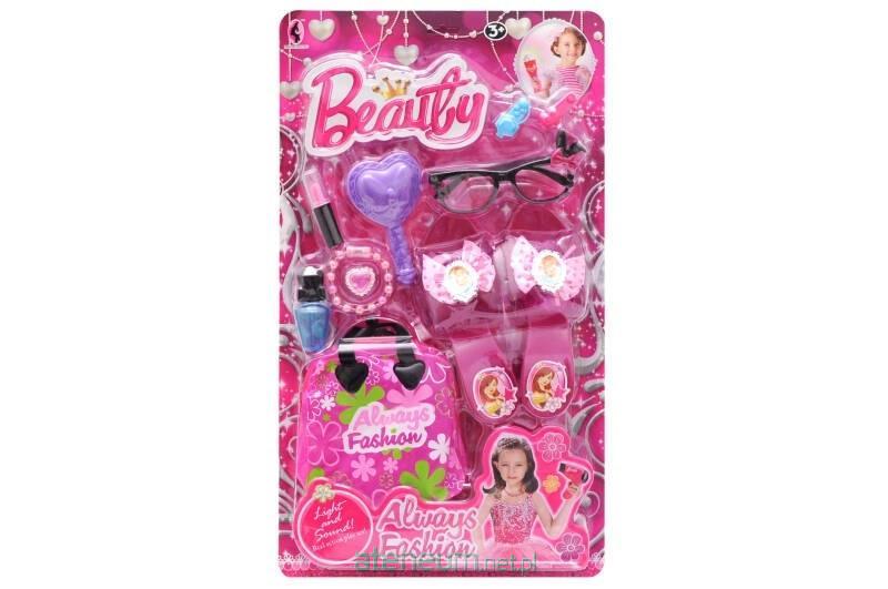 W komplecie buciki, torebeczka, szczotka, pomadka, okulary, szczotka, pierścionek, bransoletka, spinki.