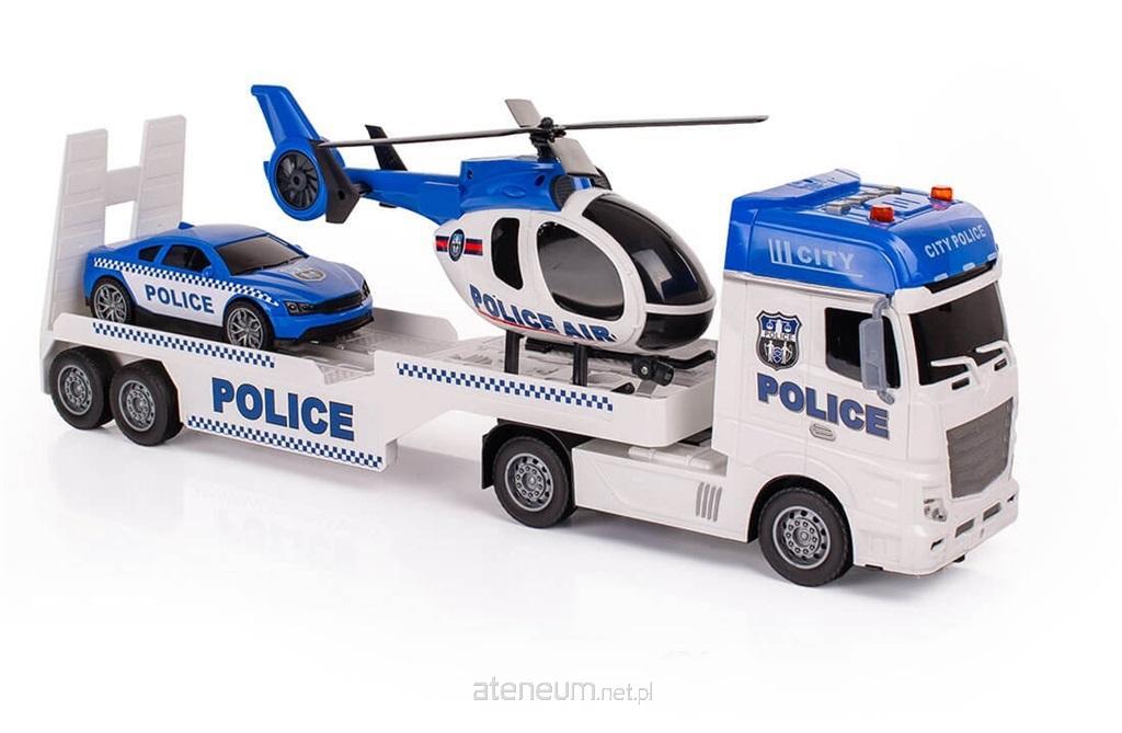 Zabawkowy Tir laweta z zestawem pojazdów to świetna zabawka dla chłopców powyżej 3 lat, która wyposażona została w dodatkowe, interaktywne funkcje. Ciągnik siodłowy posiada przyciski funkcyjne na dachu. Każdy przycisk uruchamia inny dźwięk oraz światła. Możemy usłyszeć: dźwięk zapalanego silnika, klakson, sygnał cofania. Dodatkową funkcją pojazdu jest tylna opuszczana klapa lawety, która pozwala na łatwy rozładunek pojazdów. Kolejną funkcją jest także możliwość spinania i rozprzęgania ciągnika oraz przyczepy, co znacznie podnosi walory zabawki. Napęd ciężarówki "Power Friction" - ciężarówka wyposażona została w napęd - po pchnięciu pojazdu w przód lub w tył pojazd przez chwilę porusza się samoistnie. Helikopter posiada możliwość ręcznego obracania śmigieł oraz jeden przycisk funkcyjny, uruchamiający dźwięk pracującego silnika oraz migające światło pod kokpitem i na końcu tylnej lotki.