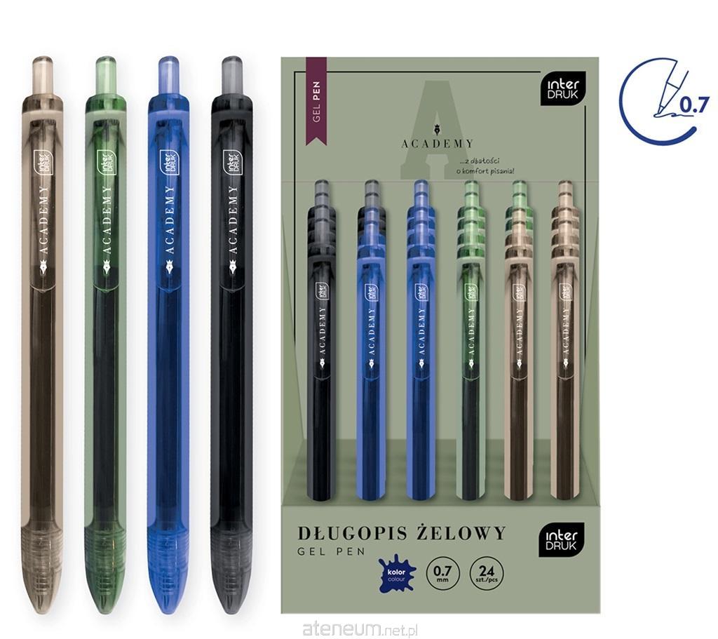 Gumowa obudowa. Niebieski wkład żelowy. Grubość pisania:0,7mm. Szybkoschnący tusz. Dostępny w 4 kolorach obudowy. 24szt w displayu