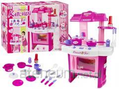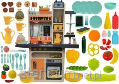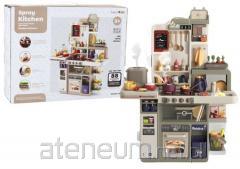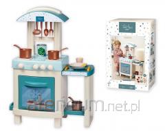 Elektroniczna kuchnia z odgłosem gotowania. Zestaw ma wiele miejsca do zabawy - blat, zlewozmywak, ekspres do kawy z kapsułkami, saturator, lodówkę, piekarnik oraz półeczki. W zestawie 27 akcesoriów, w tym rybka i kotlet usmażone z jednej strony, sztućce, talerzyki, kubeczki itp. Blat na wysokości: 50,5 cm. Wyprodukowana we Francji. Wymiary: 48 x 46,5 x 99 cm, 3l+