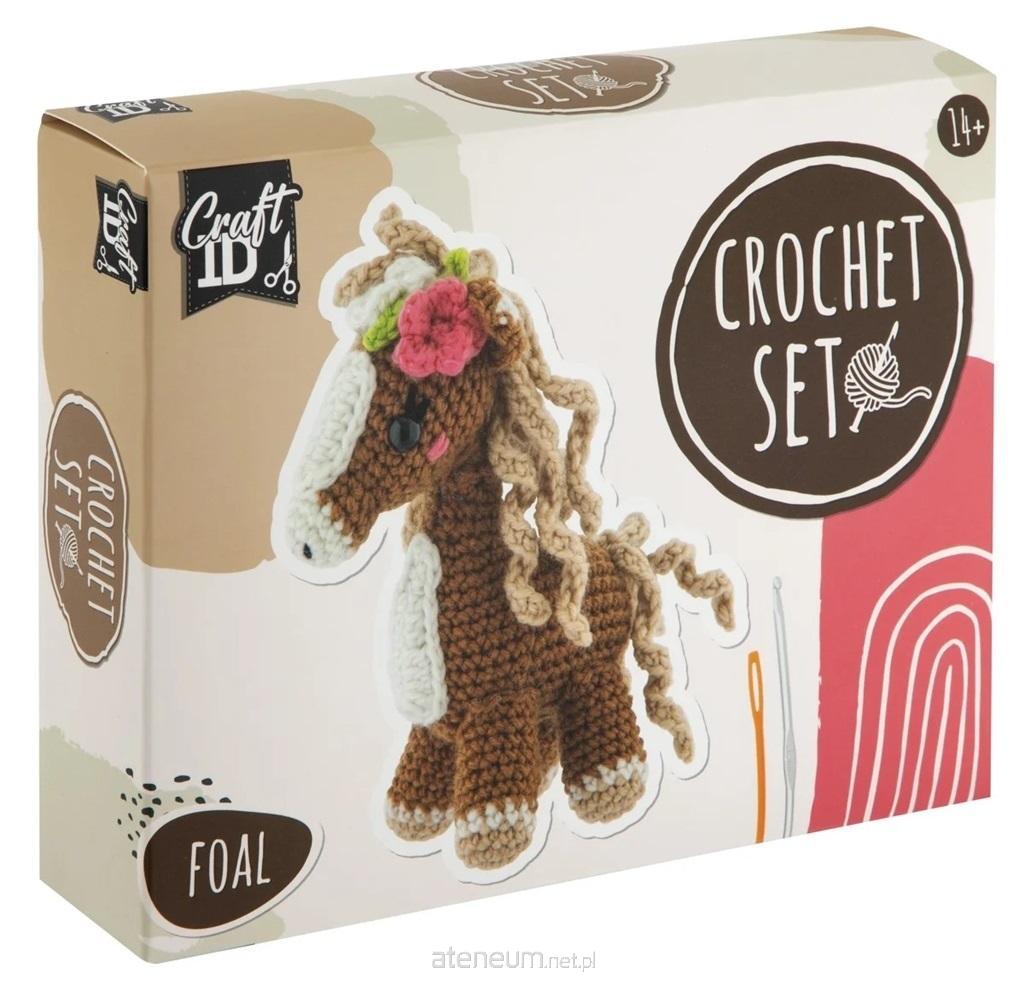 Zestaw do szydełkowania Źrebię 9,5x15,5x16 cm. Zestaw zawiera: nici w kolorze brązu, bieli i beżu, plastikowe szydełko + oczka dla konika
