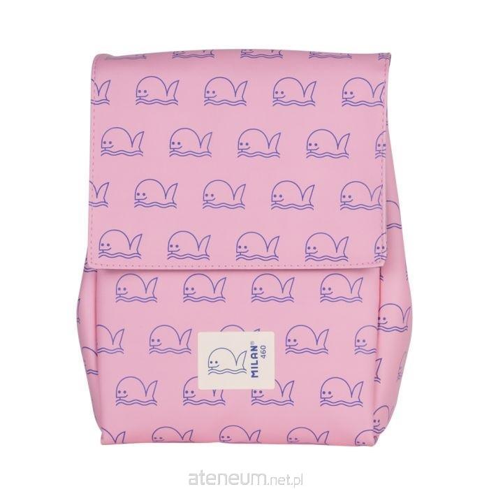 Torba izotermiczna w kolorzeróżowym z granatowym wzorem wieloryba. Kolekcja 460 inspirowana oryginalnymi kolorami i wzornictwem gumek MILAN, produkowanych w Hiszpanii od 1918 roku. Zamknięcie na rzep. Regulowany uchwyt do przenoszenia w błyszczącym niebieskim kolorze z zapięciem na klamrę. Izolowane termicznie wnętrze (zimno/gorąco) dla lepszego przechowywania żywności. Zawiera 2 hermetyczne okrągłe pudełka z zakręcaną pokrywką o pojemności 0,25 l. Skład materiału: 100% poliuretanowa tkanina zewnętrzna i izotermiczna wyściółka wewnętrzna (P.E.V.A.). Wymiary: 20 x 14 x 27 cm. Pojemność: 3,5 l