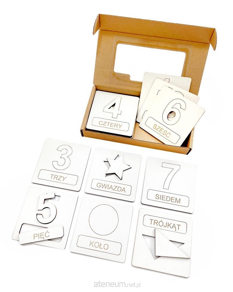 Zawiera 45 elementów (15 tabliczek z wyciętymi kształtami, 15 kształtów, 15 nazw kształtów).