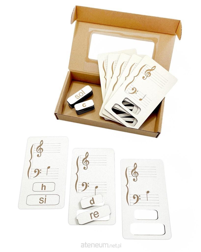 Zestaw składa się z 8 drewnianych płytek wielkości 8,5 cm na 14 cm z wygrawerowaną nutą w kluczu basowym.