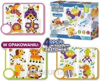 W zestawie: klocki w różnych kształtach i kolorach, 1 płytka, 4 elementy ramki, uchwyt do zawieszania obrazka, nożyk do wyjmowania klocków, możliwość ułożenia 4 obrazków, Pozostałe informacje: wym. płytki 11 x 11 cm.
