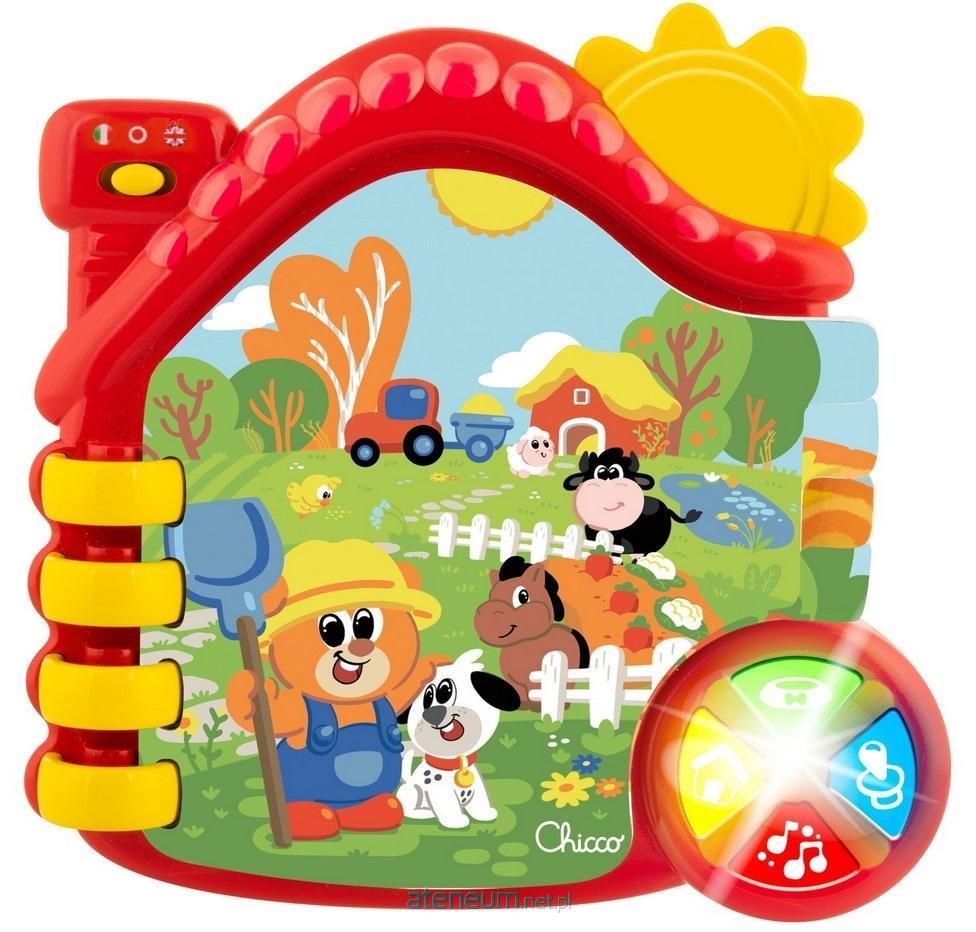 12-36 M przyciski w prawym dolnym rogu książeczki uczą ciekawostek na temat poszczególnych zwierząt z farmy przedstawionych na danej stronie. Po naciśnięciu kolejno 4 podświetlanych przycisków dziecko usłyszy odgłos zwierzęcia przedstawionego na danej stronie oraz informację gdzie mieszka na farmie, czym się żywi oraz jak nazywamy jego potomstwo.