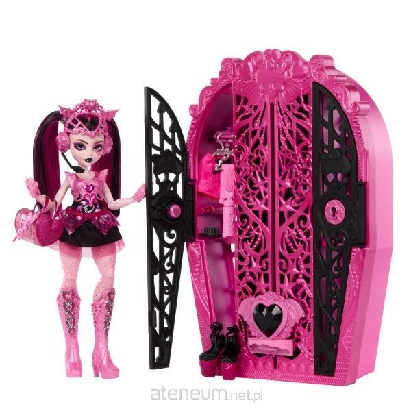 Zawartość: 1 lalka Draculaura, 1 szafa z dwojgiem drzwi, 1 klucz, 2 mapy, 3 elementy do złożenia w talizman-klucz, 2 wieszaki oraz różne ubranka i akcesoria. Lalka nie stoi samodzielnie. Kolory i elementy dekoracyjne mogą się różnić.