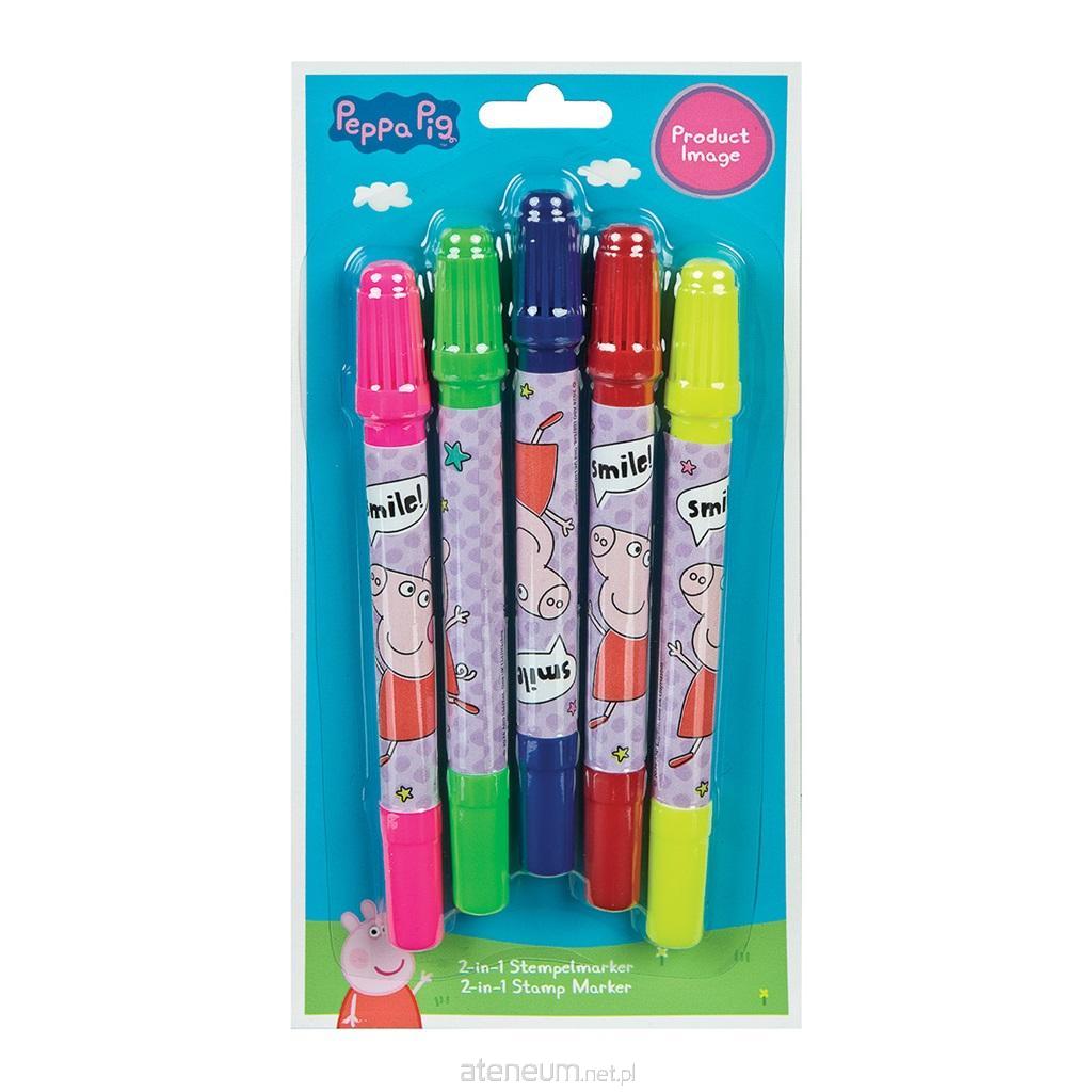 Zestaw Markerów ze Stempelkami 2w1, 5 el. Świnka Peppa Zestaw 5 markerów o podwójnej funkcji z grafikami ulubionej bajki Świnka Peppa. Z jednej strony końcówka markera w pięciu kolorach: różowym, zielonym, niebieskim, czerwonym i żółtym. Z drugiej stempel. Kategoria wiekowa:3+. Wymiary opakowania: 23 cm x 13 cm x 2 cm.