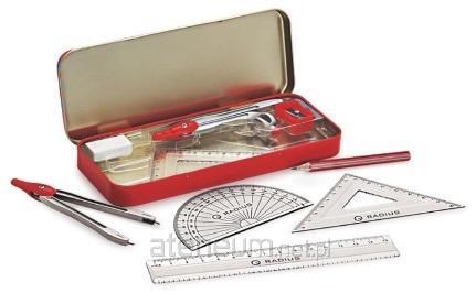 Zestaw geometryczny w metalowym opakowaniu, 9 elementów: ołówek, 2x cyrkiel, 2 ekierki, kątomierz, gumka, linijka, temperówka