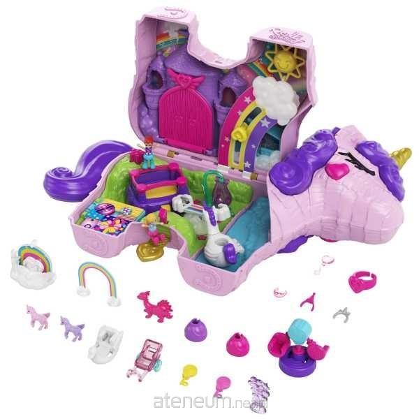 Zapraszamy na najlepsze przyjęcie-niespodziankę z zestawem Polly Pocket Jednorożec niespodzianka! Zestaw w kształcie uroczego jednorożca-piniaty ma mieniące się wysuwane skrzydełka i uchwyt ułatwiający przenoszenie. Aby rozpocząć przyjęcie, pociągnij za dźwignię i podziwiaj, jak ze środka wypada kolorowe konfetti oraz 25 niespodzianek. Super! To najlepsze przyjęcie-niespodzianka! Niektóre niespodzianki są zapakowane możesz odkryć je od razu albo zostawić na później! Wiele akcesoriów ma zaczepy ułatwiające przymocowanie ich do zestawu, aby ten wyglądał dokładnie tak, jak zechcesz. Otwórz zestaw, aby rozpocząć przygodę w stylu księżniczki z mikrolalkami Polly i Lila. Odkrywaj zakamarki pałacu księżniczek z tronem i sypialnią, poskacz na trampolinie, pohuśtaj się na huśtawce, jedź na tęczowej chmurce, włóż niespodzianki do schowka i pływaj po rzece na dmuchanym jednorożcu. Akcesoriami można bawić się zarówno w środku, jak i na zewnątrz zestawu. Wśród nich są: 2 jednorożce z powozem, smok, kwiatowa huśtawka, lizakowa huśtawka, stoisko z balonikami, naszyjnik i pierścionek (niektóre akcesoria można nosić), 2 tiary, 2 spódniczki dla księżniczek i 2 lizaki, które lalki mogą trzymać w rączkach. Zapraszamy na przygodę w stylu księżniczek z zestawem Jednorożec niespodzianka. Dzięki technologii Polly Stick mikrolalki można przyczepić w każdym miejscu zestawu. Umieść naklejkę z arkusza (w zestawie) w dowolnym miejscu zamku, by móc przyczepić tam lalkę! To doskonały prezent dla dzieci od 4 roku życia, szczególnie tych, które uwielbiają jednorożce, księżniczki oraz magiczne niespodzianki. Kolory i elementy dekoracyjne mogą się różnić.