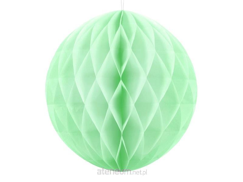 Kula bibułowa w kolorze pistacjowym o średnicy około 40 centymetrów. Produkt wielokrotnego użytku. Montaż przy pomocy spinacza.