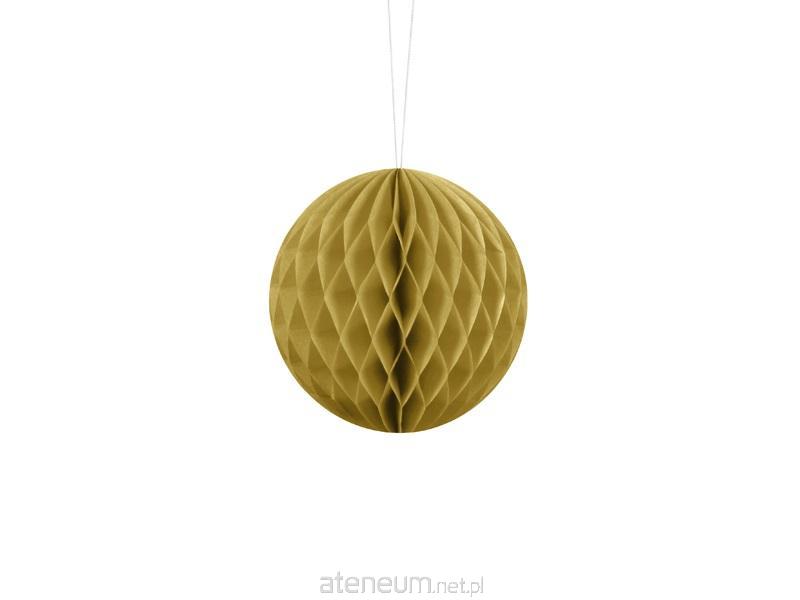 Kula bibułowa w kolorze złotym o średnicy około 10 centymetrów. Produkt wielokrotnego użytku. Montaż przy pomocy spinacza.