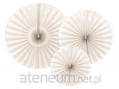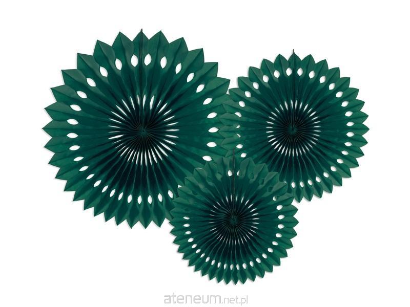 Rozety dekoracyjne wykonane z bibuły w kolorze ciemnozielonym, średnice po złożeniu ok. 20 cm, 25 cm i 30 cm. Produkt wielokrotnego użytku. Montaż przy pomocy spinacza.(1 op. / 3 szt.)