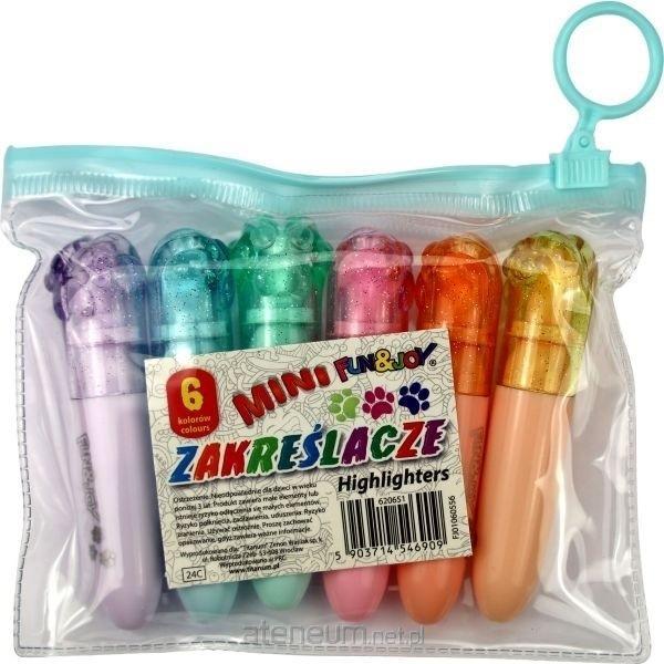 Zestaw 6 zakreślaczy w rozmiarze mini. Okrągła obudowa zakończona słodką przeźroczystą łapką w kolorze tuszu. Grubość linii pisania 1-4 mm. Pakowane w praktyczny woreczek na suwak.