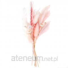 W skład bukietu wchodzą: biały lagurus, czerwona trawa kryształowa, różowy zatrwian, różówy len, różowa drakiew gwiaździsta, biały żarnowiec miotlasty, zielona trawa dzwonkowa