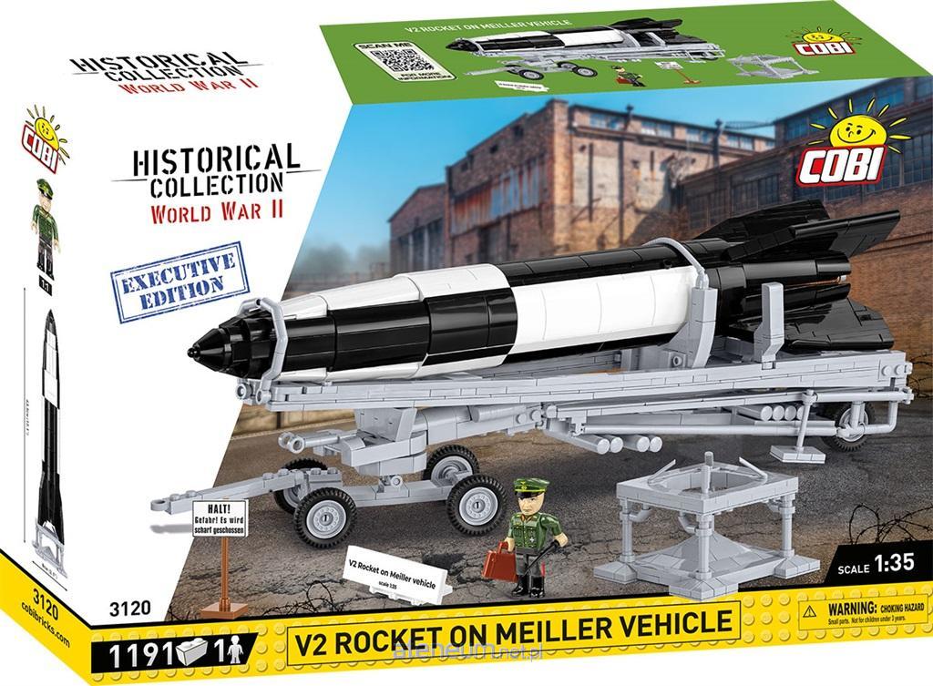 COBI-3120 "V2 Rocket & Transporter" - EXECUTIVE EDITION Historical Collection WORLD WAR II 1191 klocków 1 figurka Skala: 1:35 Grupa wiekowa: 10+ Rakieta V2 to jedna z najbardziej znanych tzw. cudownych broni (niem. "Wunderwaffe"), które miały odwrócić losy wojny. Konstrukcja ta do dziś budzi fascynację wielu entuzjastów historii i II wojny światowej. Ta legendarna konstrukcja była tak pożądana, że firma COBI nie mogła oprzeć się wciąż mnożącym się pytaniom o ten zestaw. Oto legendarna rakieta V2 w skali 1:35 w wersji Executive Edition wzbogaconej o dodatkowe klocki. Sama rakieta posiada zdejmowane poszycie, pod którymi kryje się odwzorowane wnętrze: potężny rakietowy silnik, zbiornik paliwa oraz głowica z ładunkiem wybuchowym! W zestawie Executive Edition składającym się z 1191 elementów znajdują się: - Model rakiety V2 - Podstawa do transportu i strzelania - Figurka przedstawiająca generała Waltera Dornbegera - Dodatkowe klocki przedstawiające znak ostrzegawczy - Biała tabliczka z nazwą zestawu Rakiety V2 (Vergeltungswaffe 2) były pierwszymi na świecie rakietami balistycznymi dalekiego zasięgu. Zostały opracowane przez nazistowskie Niemcy podczas II wojny światowej, a ich głównym konstruktorem był Wernher von Braun. V2 były używane przez Niemców głównie do ataków na Londyn i inne miasta alianckie od 1944 roku. V2 miały zasięg około 300 km i mogły przenosić ładunek wybuchowy o masie około 1 tony. Konstrukcja w pionierski sposób była oparta na silnikach spalających paliwo ciekłe. Po wystrzeleniu rakieta wznosiła się na wysokość ok. 100 km (to już przestrzeń kosmiczna!), a następnie spadała na cel z ogromną prędkością, co czyniło ją praktycznie niemożliwą do przechwycenia. V-2 była prekursorem nowoczesnych rakiet balistycznych i miała znaczący wpływ na rozwój technologii kosmicznej po wojnie. - 1191 wysokiej jakości elementów - Wyprodukowane w UE przez firmę z ponad 35-letnią tradycją, spełniają normy bezpieczeństwa dotyczące produktów dla dzieci, w pełni kompatybilne z innymi markami klocków konstrukcyjnych, zastosowano tylko trwałe nadruki bez użycia naklejek, czytelna i intuicyjna instrukcja oparta na rysunkach i ikonach - 1 figurka - Tabliczka z nazwą - Akcesoria do figurki - Skala 1:35 - Wymiary modelu (dł x wys): 405mm x 24mm x 130mm 485mm x 24mm x 435mm - z podstawą i uniesioną rakietą