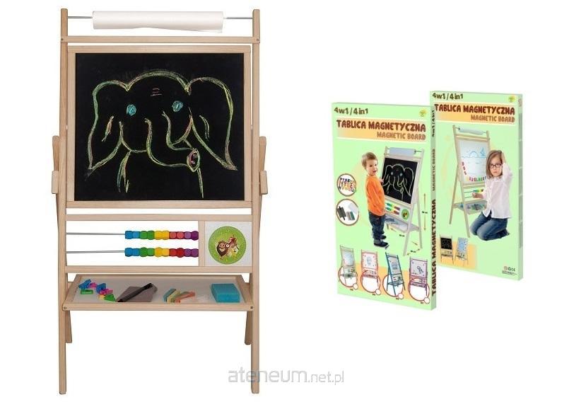 Obrotowa, naturalna, suchościeralno-kredowo-magnetyczna tablica z 2-rzędowym liczydłem i rolką papieru do rysowania, zegar z motywem zwierzątek z ruchomymi wskazówkami. Wyposażona w gąbkę i 5 kolorów kredy. Do gąbki dołączony polar do wycierania markera. Literki magnetyczne oraz marker w zestawie.