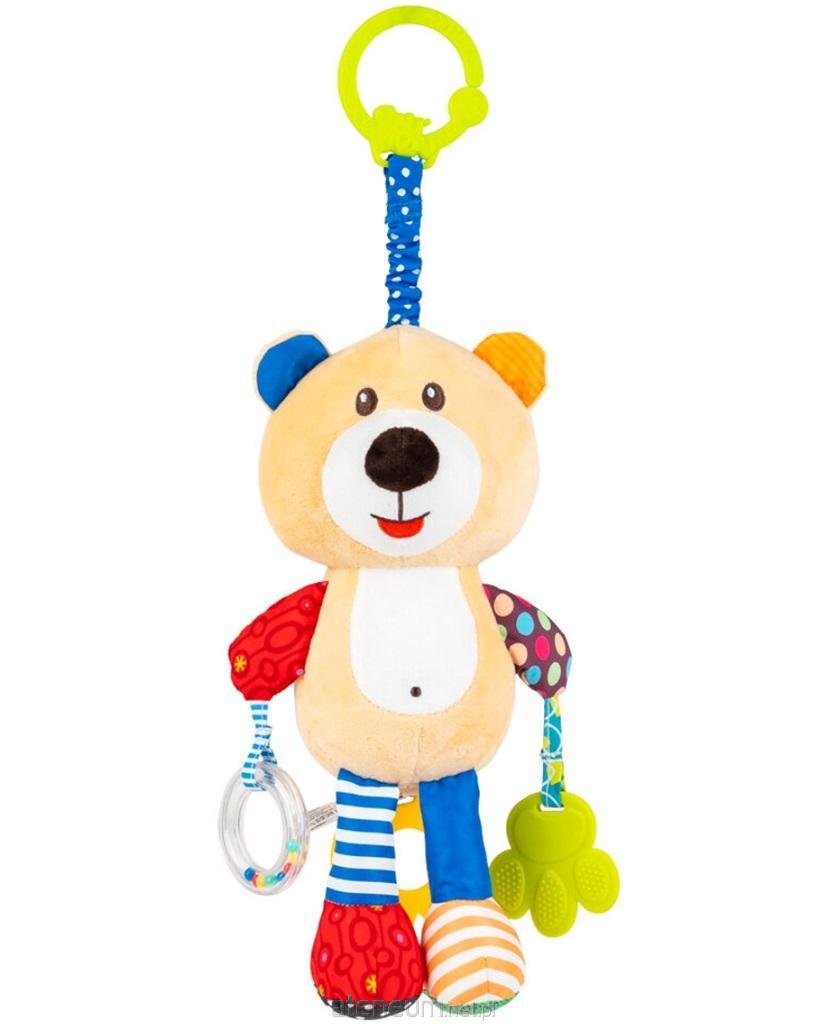 Kolorowy misiek w marynarskich kolorach zabawi malucha na wiele sposobów. Zabawka posiada grzechotkę i dwa miękkie gryzaki, które przyniosą ulgę obolałym dziąsłom ząbkującego bobasa. Jeden z gryzaków kwiatek, doszyty w miejscu misiowego ogonka, uruchamia dodatkowo melodię. Wystarczy go pociągnąć, a miś zagra słodką kołysankę. Nad głową pluszaka znajduje się materiałowa harmonijka, a po lekkim pociągnięciu zabawki, podciągnie się na niej z powrotem, delikatnie podskakując. Misiek został wykonana z materiałów o zróżnicowanych kolorach, wzorach i fakturach, dzięki czemu stymuluje on zmysły malucha, rozwijając przy tym jego zdolności poznawcze.