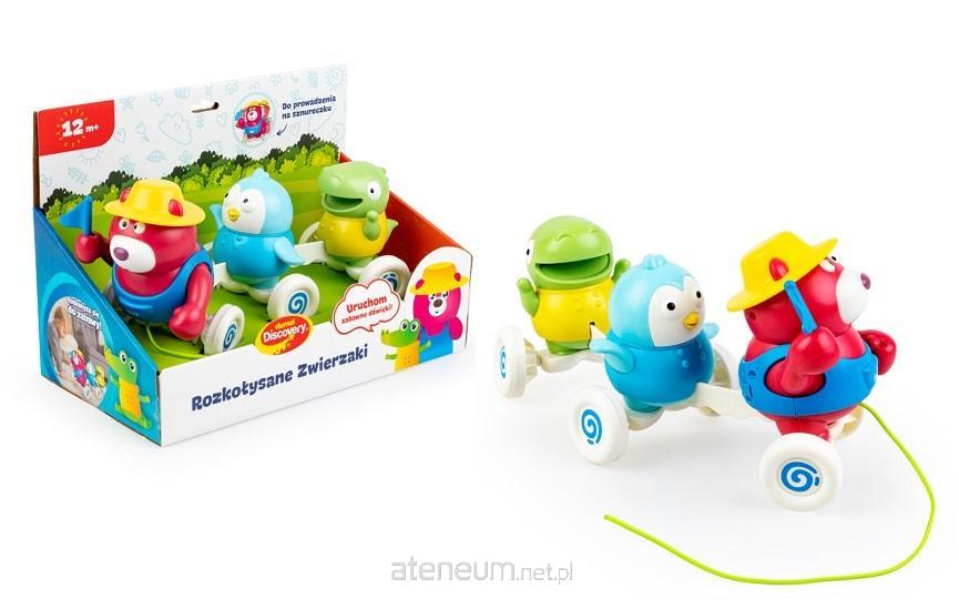 Pociąg z trzema wesołymi pasażerami czeka na przejażdżkę! Zabawka wyposażona jest w sznureczek do prowadzenia rączką. Podczas jazdy, zwierzaki kołyszą się na boki, podobnie jak kółeczka pojazdu, które ozdobione są wzorkiem, przez co ich poruszanie się wywołuje ciekawy efekt wizualny. Pociąganie za sznureczek uruchamia zabawne dźwięki i melodie, które umilą zabawę.